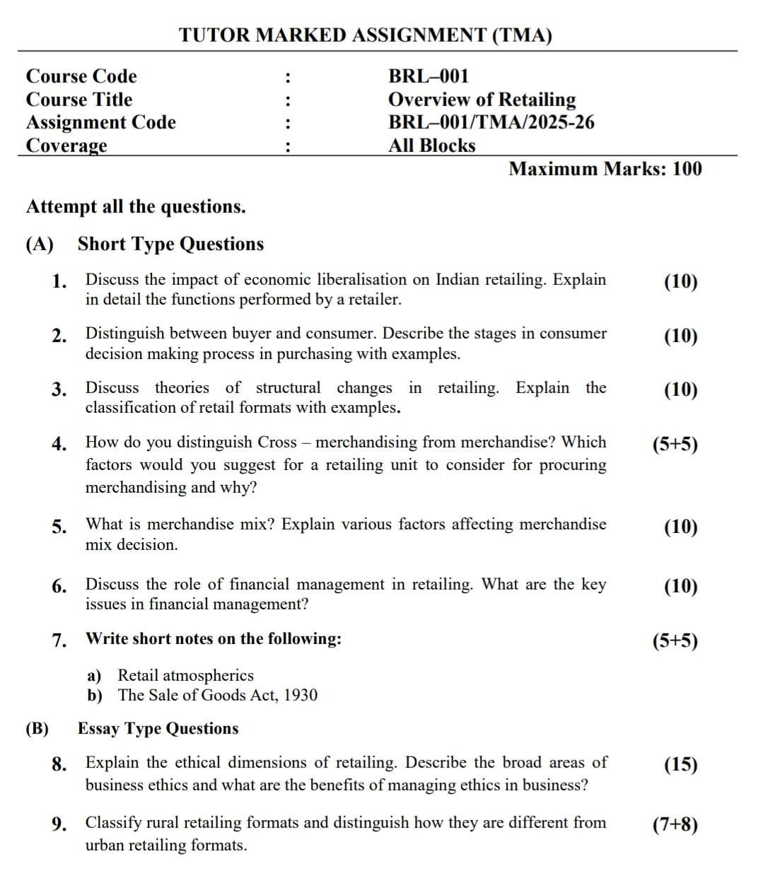 BRL 001 (Overview of Retailing) is an introductory course offered by IGNOU under the Certificate and Diploma programmes in Retail Management. This course provides a comprehensive understanding of the retail industry, its structure, and its growing importance in the Indian economy.