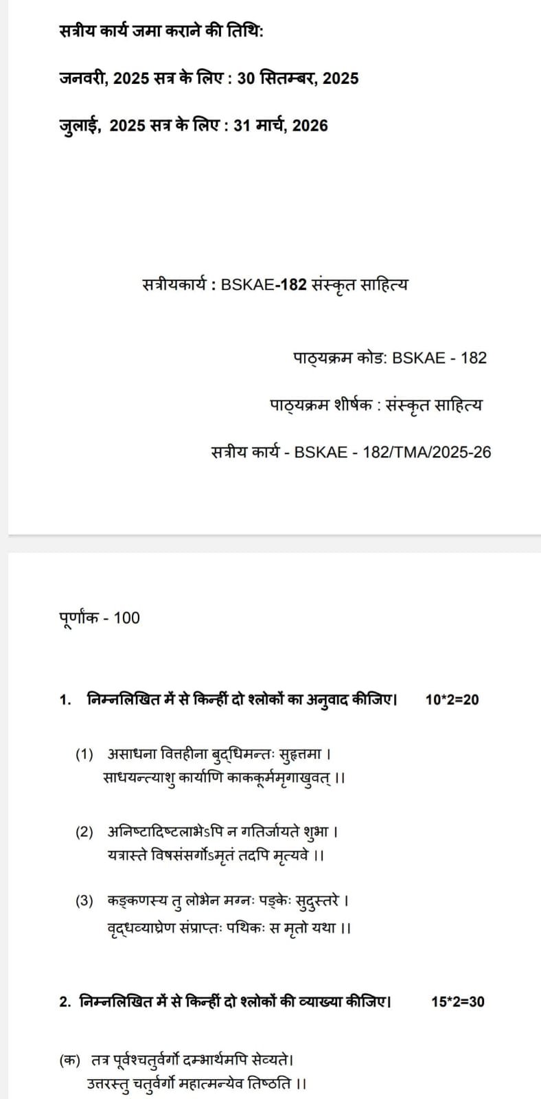 BSKAE 182 IGNOU Solved Assignments 2025-26 (Sanskrit) PDF Download – IGNOU Galaxy