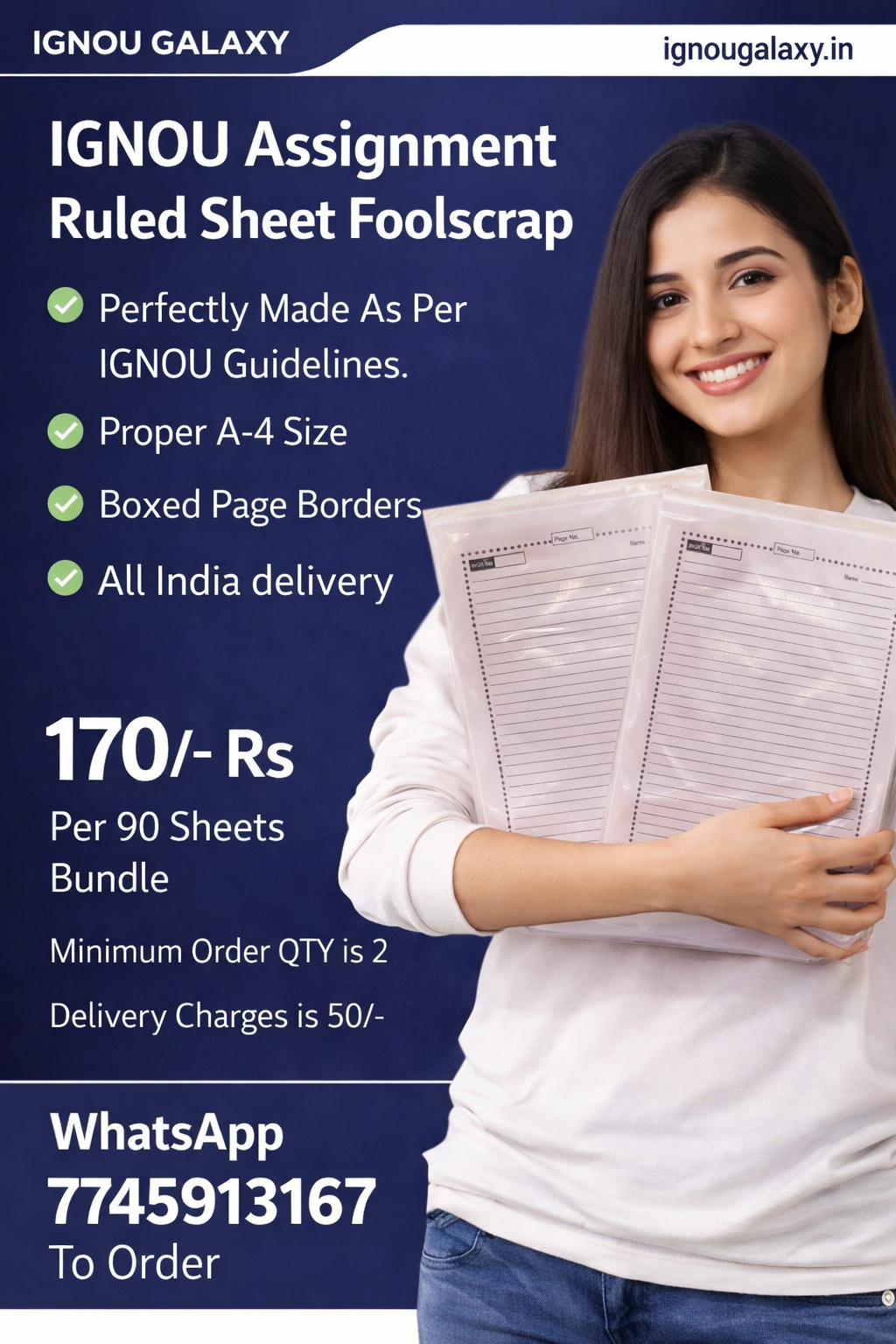 Buy premium ruled sheets strictly designed in the IGNOU assignment paper format, featuring proper A-4 size, clean ruling, and boxed page borders. These IGNOU assignment ruled papers fully comply with IGNOU guidelines, offer good paper quality, and are ideal for handwritten assignments across all programmes. Fast delivery available.