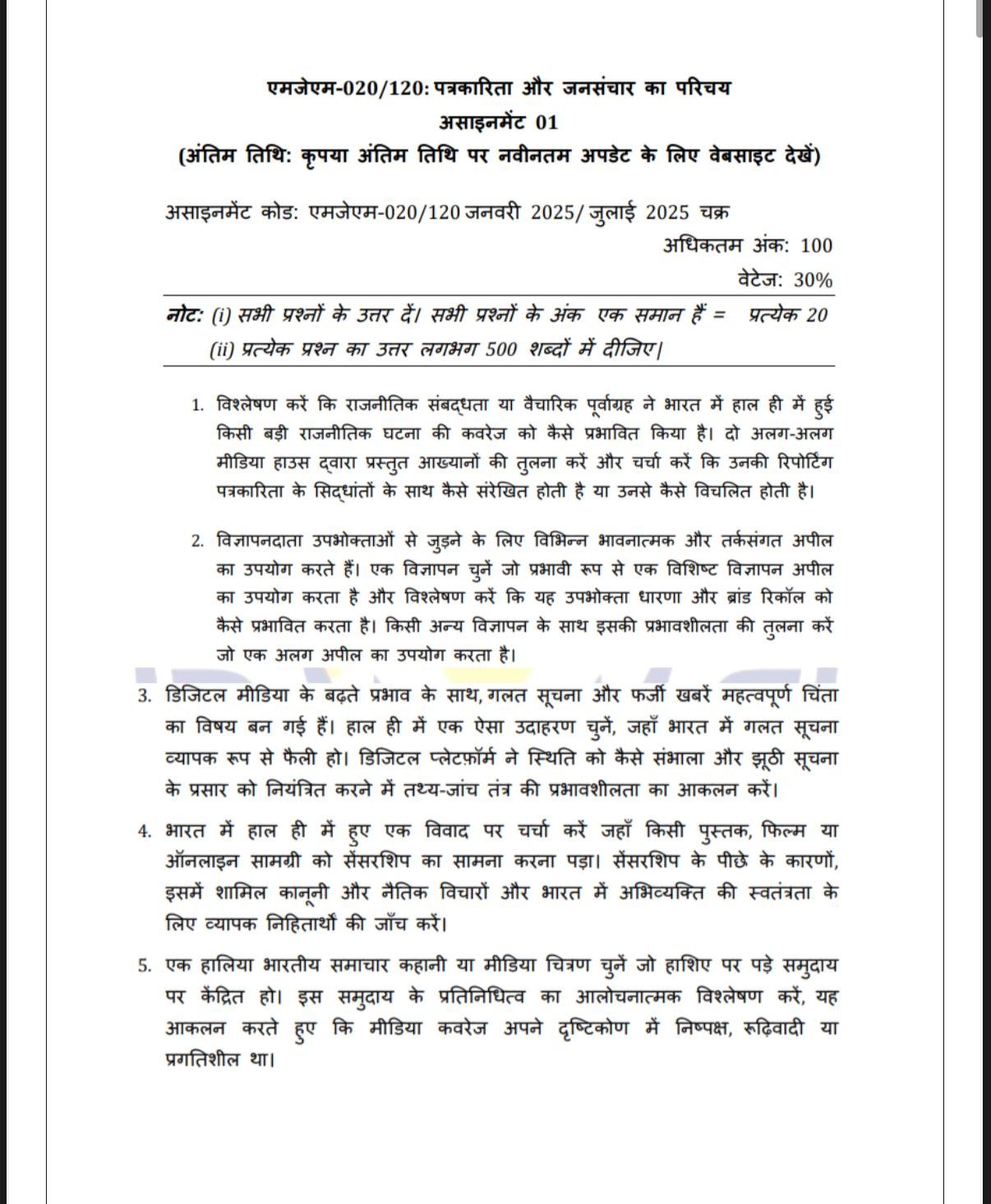 MJM 020 (120) IGNOU Solved Assignments 2025 (HINDI) PDF Download – IGNOU Galaxy